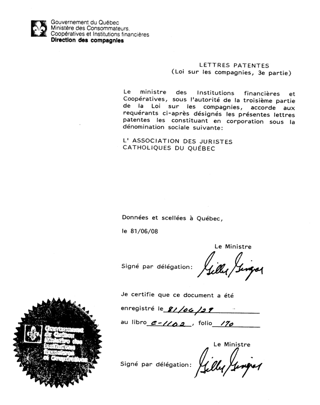 Afin de contribuer à un authentique renouvellement chrétien de la société contemporaine, plus particulièrement dans les milieux juridiques et para juridiques, et afin de constituer un instrument efficace d’union, de réflexion et d’action, il est suggéré de créer une Association des juristes catholiques du Québec qui aurait pour but: