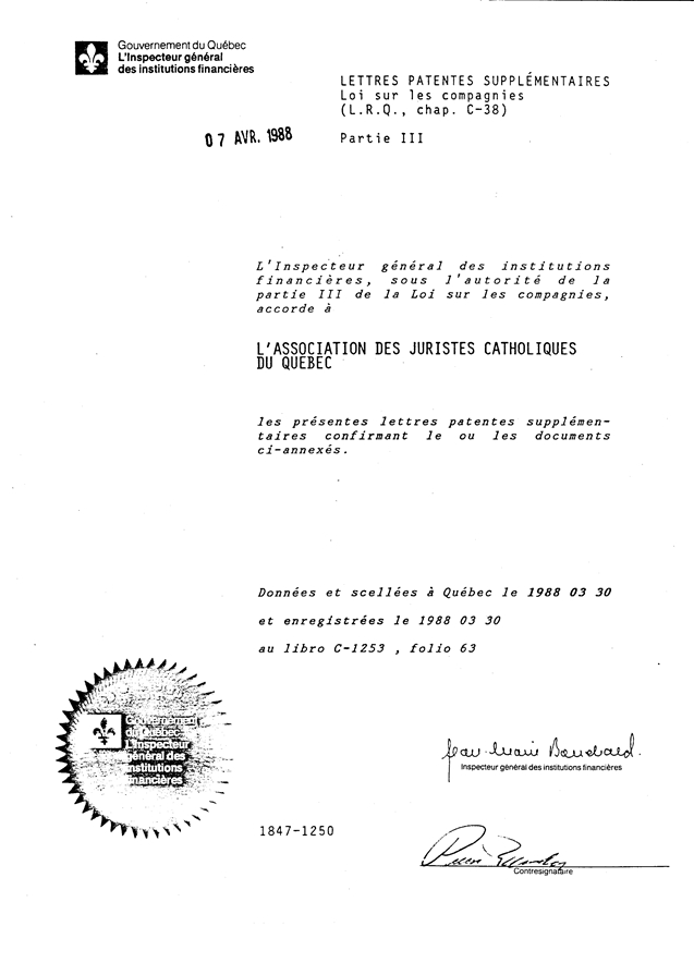 LETTRES PATENTES DE L'ASSOCIATION DES JURISTES CATHOLIQUES DU QUEBEC